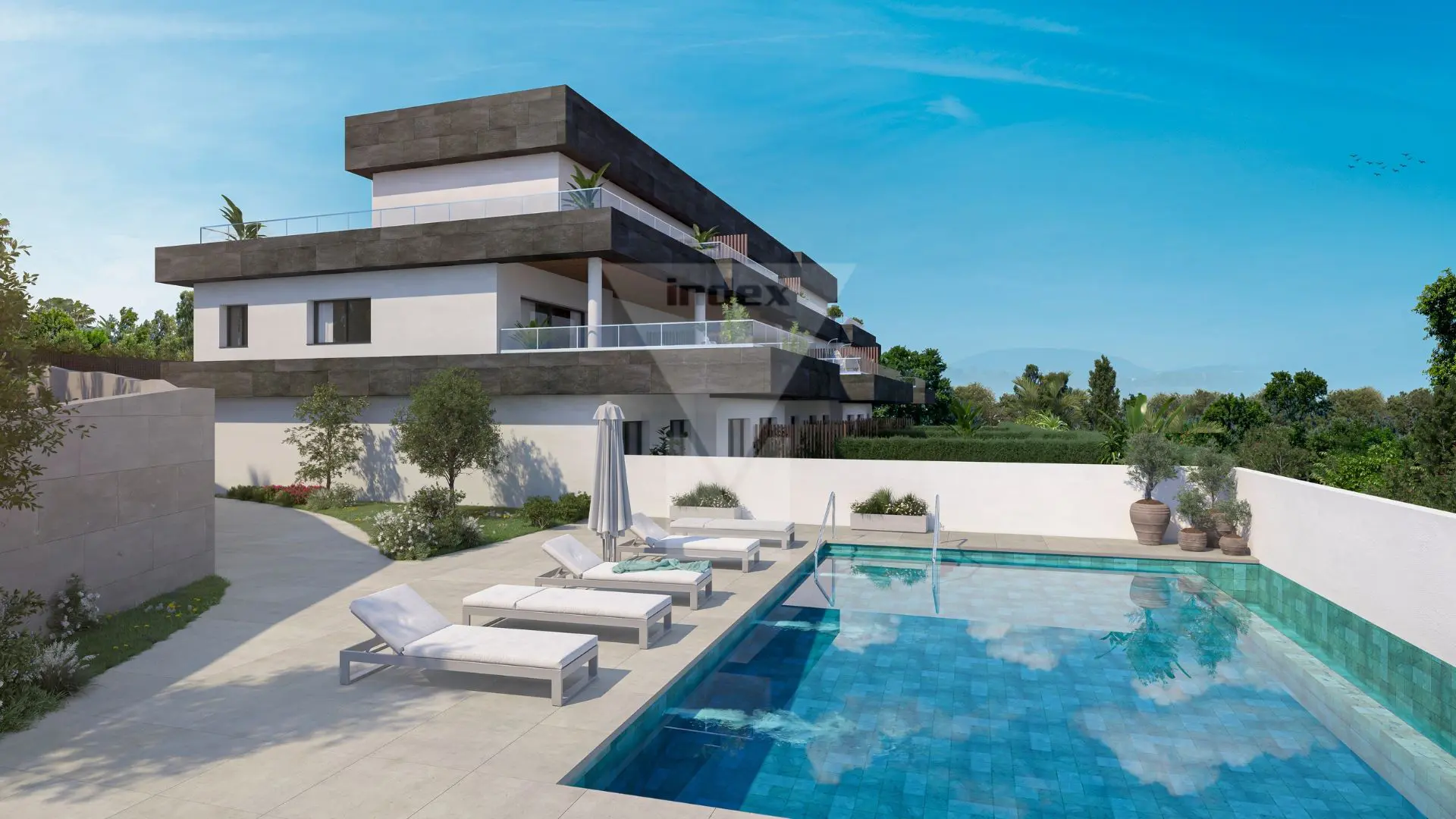 Viviendas plurifamiliares de varias tipologías y tamaños, con amplias terrazas, parcelas privadas, piscina, aparcamientos, zonas ajardinadas y exteriores vanguardistas.