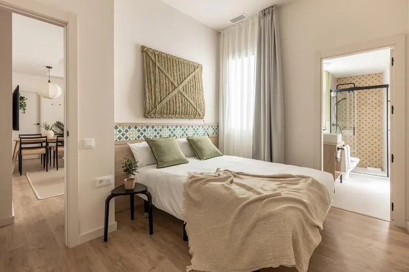En los apartamentos, los baños lucen azulejos geométricos en tonos terracota y verde, que vuelven a evocar el estilo de la antigua Córdoba. Los dormitorios presentan papeles pintados que actúan como zócalos en los cabeceros, complementados con cortinas decorativas de esparto.