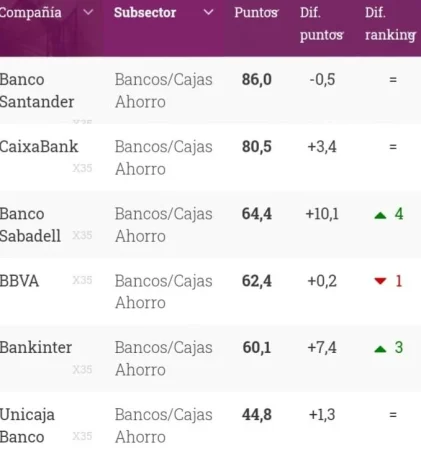 En la banca, el ránking lo encabeza Banco Santander, que obtiene 86 puntos, mientras que Caixabank, que a nivel general ocupa el sexto lugar, se encuentra en el segundo a nivel de bancos (80,5 puntos), mientras que Banco Sabadell es el tercero (64,4), BBVA, el cuarto (62,4); Bankinter, el quinto (60,1) y Unicaja el último (44,8).