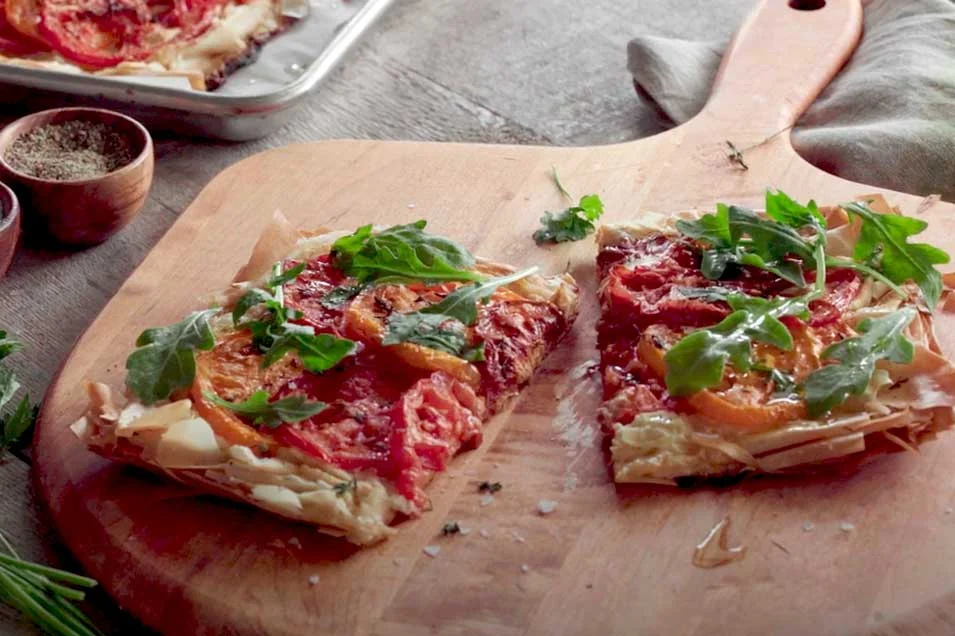 Una vez horneada la base de hojaldre, extendemos uniformemente la mezcla de ricotta sobre el centro de la masa, dejando los bordes libres para que queden crujientes y dorados. A continuación, colocamos 500 gramos de tomates de varios colores y tamaños sobre la tarta, distribuyéndolos de manera que cada porción tenga una combinación variada. Rociamos la tarta con dos cucharadas de aceite de oliva y espolvoreamos hojas de menta fresca, sal marina en escamas y pimienta recién molida.