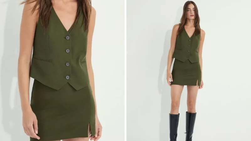 El conjunto de Stradivarius está compuesto por dos piezas esenciales que se complementan a la perfección: un chaleco corto con escote en pico y una falda pantalón que resulta cómoda y elegante. El chaleco destaca por su estilo moderno y minimalista, con detalles de falsos bolsillos y un cierre frontal con botones que le aporta un toque clásico. Disponible en colores en verde oliva, crema y negro, es una prenda que combina con cualquier tipo de calzado y accesorio, adaptándose fácilmente a diferentes estilos.