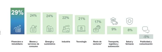 El Financiero e inmobiliario también se sitúa en el pódium, esta vez en segundo lugar, con un 32%, y por encima de la media internacional (25%).