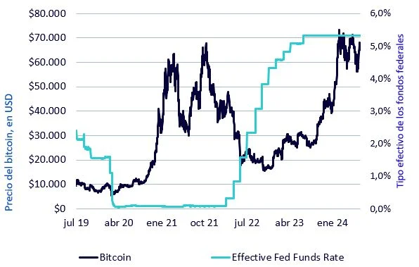 Fuente: Bloomberg. Datos a 26 de julio de 2024. Índice de tickers: XBTUSD y FEDL01. No se puede invertir directamente en un índice. La rentabilidad histórica no es indicativa de la rentabilidad futura y cualquier inversión puede perder valor.