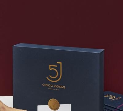 La nueva imagen de Cinco Jotas rinde homenaje a su herencia y a su proceso de elaboración artesanal. La paleta cromática, compuesta por el albero -un tono cálido que evoca la tierra y la tradición- y el azul noche -que aporta un toque de elegancia y exclusividad-, representa la fusión entre lo tradicional y lo innovador.