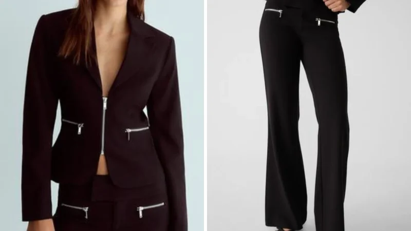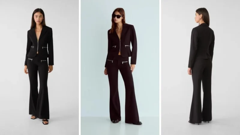 El último conjunto de Stradivarius se compone de una americana ‘cropped’ y un pantalón de corte ‘flare’, y ambos están diseñados para resaltar lo mejor de tu silueta. La americana, ajustada al cuerpo, cuenta con un cierre de cremallera que crea un escote en pico, añadiendo un toque sensual y moderno. Además, las hombreras y la abertura en el bajo contribuyen a un efecto visual que afina la cintura, destacando la figura de manera natural. Disponible en tallas desde la XS hasta la XL, esta prenda promete ser un básico en tu armario.