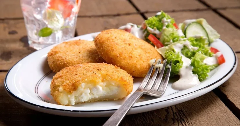 A continuación, añade la harina de garbanzos al puré de patatas. La proporción es muy sencilla: utiliza una parte de harina de garbanzos por cada parte de puré. Una vez mezclados, forma bolas de masa y aplánalas un poco. En el centro de cada bola, coloca un poco de queso antes de cerrarlas cuidadosamente para que el relleno no se escape.
