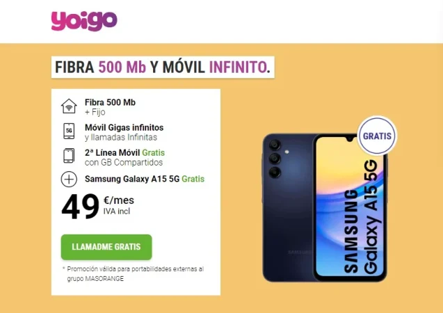 Yoigo, la operadora perteneciente al grupo MasOrange, tiene la oferta de otoño más llamativa de España en lo que a tarifa convergente de conectividad se refiere. Además de de ofrecer totalmente gratis uno de los smartphones estrella de 2024, el Samsung Galaxy A15 5G con capacidades de IA, pone en los hogares fibra con 500Mb, una velocidad poco habitual, y lo que llaman «gigas infinitos», que viene a indicar que no hay un tope como en los ilimitados, en los que la velocidad decae llegado a un punto máximo de consumo. La segunda línea de móvil gratis hacen de esta tarifa un verdadero caramelo para nuevos y viejos hogares, que quieren internet y móvil por solo 49 euros al mes.