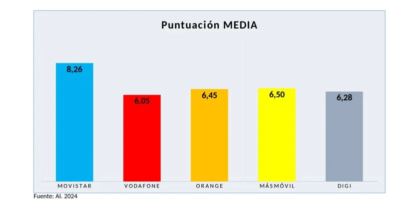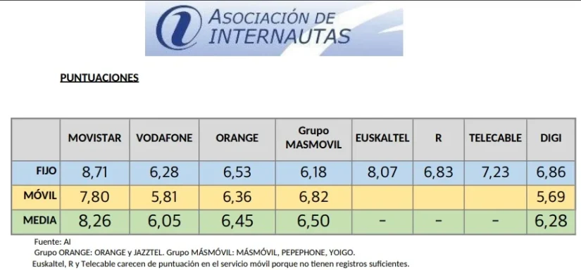 Según sus mediciones, «el resto de los operadores no alcanzan los 8 puntos en banda ancha fija (BAF), salvo Euskaltel, ni los 7 puntos en banda ancha móvil (BAM)». Así, reflejan que en cuanto a la nota media alcanzada por los distintos operadores españoles, la más alta es para Movistar, con un 8,26, y la más baja para Vodafone, que llega hasta el 6,05. «El resto también se queda lejos de los siete puntos», puntualizan, y afirman que el grupo Másmóvil, con 6,18 puntos, es el último clasificado en BAF, mientras que Vodafone, con 5,38, lo es en BAM.