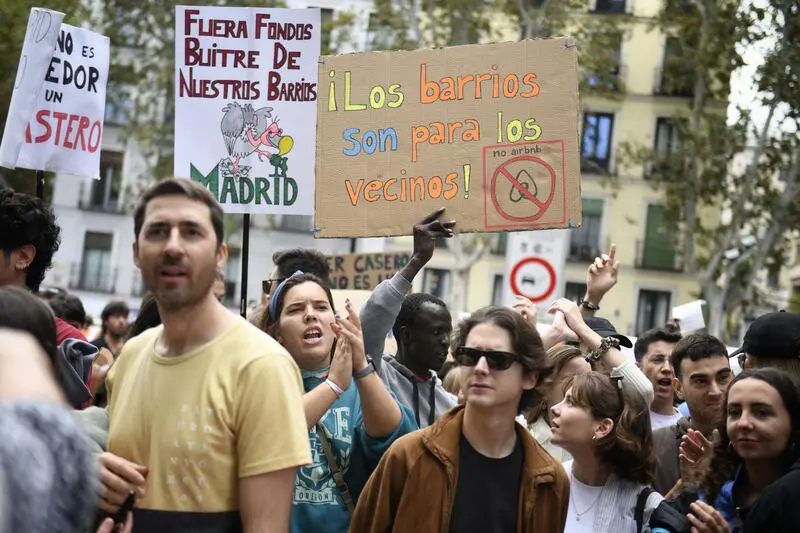Miles de personas, 12.000 según datos de la Delegación del Gobierno en Madrid, se han manifestado este domingo en las calles de Madrid para pedir la reducción de los precios del alquiler tanto en la capital como en el resto de España.