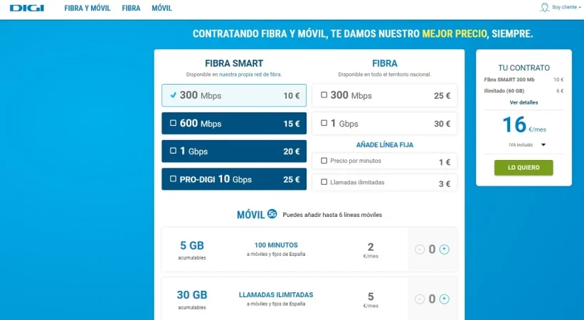 Digi acaba de lanzar un nuevo producto de fibra SMART de 300Mbps por 10 euros al mes y ha mejorado todas sus tarifas de telefonía móvil, con lo que tal y como explica la compañía «reafirma su compromiso de ofrecer a sus clientes su mejor propuesta». La propuesta es amplia y renueva a la baja todas las tarifas de la compañía.