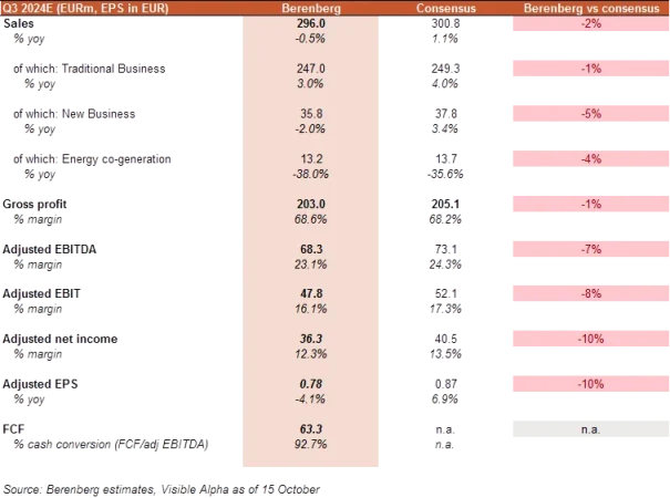 Thielmann, que tiene una recomendación de Comprar en Viscofan prevé unas ventas en el tercer trimestre de 296 millones de euros (-0,5% interanual), impulsadas en particular por las ventas de nuevas actividades (NB), un 2% menos interanual debido a la debilidad de la demanda de carcasas de plástico (que deberían representar alrededor del 80% de las ventas de NB) y a las ventas de cogeneración de energía, que disminuyen un 38% interanual, según nuestras cifras.