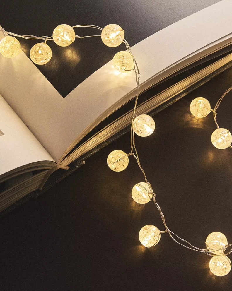 Esta guirnalda clásica repleta de bolas con luz en su interior mide 250 cm y funciona con pilas AA. Para colocarla sin mayores inconvenientes, te recomendamos empezar a ponerla desde abajo e ir subiendo poco a poco. La encuentras en Zara Home a cambio de 25,99€.