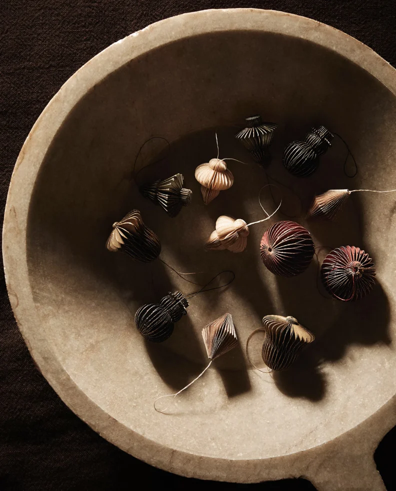 Partiendo de la tendencia de las bolas de papel tipo origami, en esta oportunidad esta tienda las ha rediseñado incluyendo un toque navideño y elegante por medio de colores como el ocre y el marrón chocolate. El paquete trae 12 bolas (dos en forma de árbol navideño, dos en forma de muñeco de nieve, dos en forma de campana, dos en forma de diamante y cuatro de farolillo) y cuesta 15,99€.