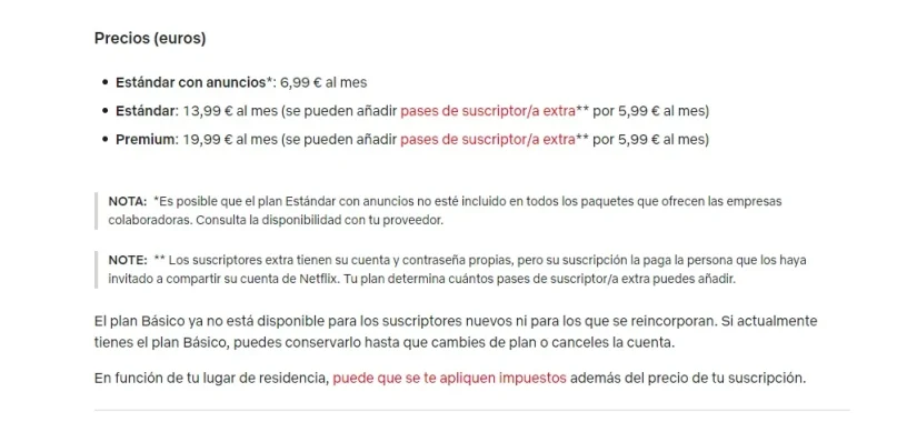 Así, en nuestro país, tal y como se puede comprobar en su página web oficial, los suscriptores de los diferentes planes que ofrece en España tendrán que abonar un precio de 6,99 euros al mes (antes 5,49) para el plan estándar con anuncios y de 13,99 euros mensuales (antes 12,99) en el caso del plan estándar sin cortes publicitarios. La tarifa del plan premium sube a 19,99 euros al mes, dos euros respecto a los 17,99 que costaba hasta el pasado jueves por la noche. La compañía señala que «la actualización se aplicará a todos nuestros suscriptores», en el país.