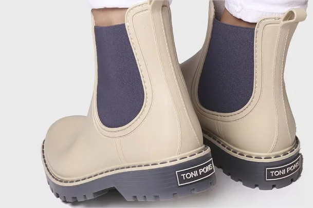 Los botines de agua de goma con elásticos son la solución perfecta para esos días lluviosos en los que no quieres perder estilo. Hechos de goma resistente al agua, en un moderno color blanco, estos botines no solo te mantendrán seca, sino que también te aportarán un toque urbano y actual. Sus elásticos laterales aseguran un ajuste perfecto y fácil de poner.