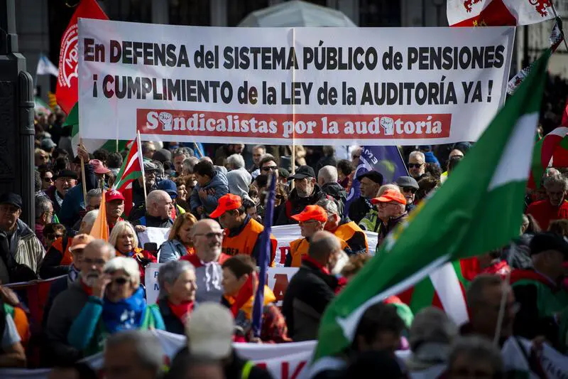 Centenares de personas convocadas en Madrid por la Unidad de Acción de Organizaciones de Pensionistas de los Pueblos y Comunidades del Estado han pedido este sábado una subida de las pensiones al Gobierno de Pedro Sánchez y la defensa del sistema público para su gestión.