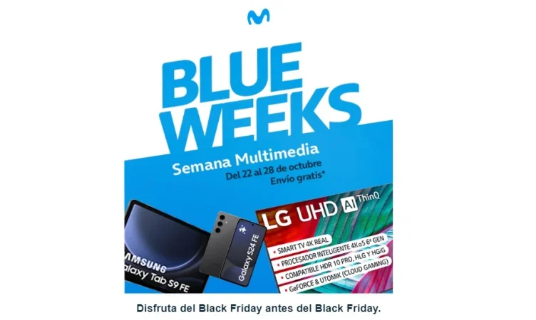 Movistar ha puesto en marcha una campaña de ventas con descuentos bajo el lema «disfruta del Black Friday antes del Black Friday«. Se trata de lo que han venido a llamar desde la centenaria operadora presidida por José María Álvarez-Pallete la «Semana Multimedia en las Blue Weeks», una iniciativa orientada a fomentar el consumo en las aciagas semanas de octubre en las que nadie compra porque vienen los descuentos de noviembre y las novedades cada a las navidades. La primera está dedicada a los dispositivos multimedia, y el resto de semanas serán otros artículos los que estarán rebajados.