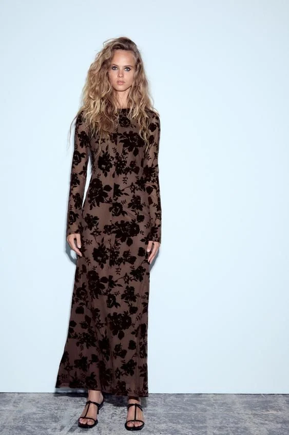 Descubre el vestido largo de tul flocado de Zara, una prenda que combina elegancia y estilo boho a la perfección. Con un precio de 49,95 EUR, este vestido es una inversión que elevará cualquier look. Diseñado con un cuello redondo y mangas largas, presenta un encantador detalle de flores flocadas que añade un toque romántico y femenino. Su escote fluido en la espalda, acompañado de un cierre con botón, permite una sofisticada apertura que realza la figura y agrega un aire de misterio.