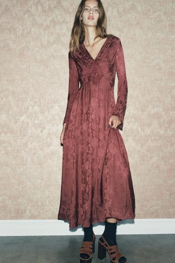 Descubre el elegante vestido jacquard bordado de la colección ZW de Zara, una opción perfecta para quienes buscan sofisticación y estilo en cada ocasión. Con un precio de 69,95 EUR, este vestido midi está confeccionado en hilatura de viscosa, lo que garantiza un ajuste cómodo y fluido. Su escote en pico y las mangas largas acabadas en línea evasé añaden un toque de feminidad y distinción, convirtiéndolo en una prenda ideal tanto para eventos formales como para ocasiones especiales.