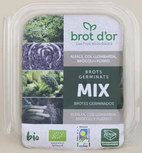 La alerta abarca varios productos de brotes germinados, destacando los más relevantes. Entre ellos se encuentran los brotes germinados de col lombarda de la marca BROT D´OR, con el número de lote 0106-42-04-24 y fecha de caducidad el 12/11/2024, envasados en unidades de 70 g y con refrigeración como temperatura de conservación. También están el mix de brotes germinados de la misma marca, con el número de lote 0401-42-04-24 y las mismas condiciones de caducidad y conservación.