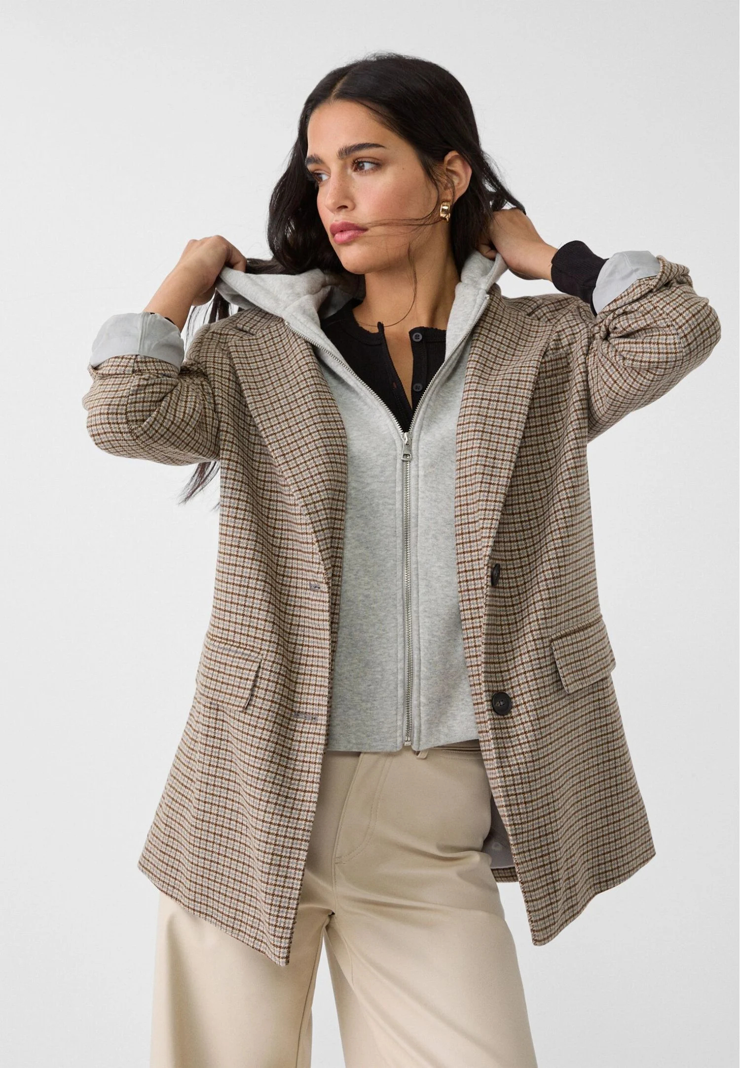 La americana larga combinada con capucha de Stradivarius fusiona estilo urbano y elegancia clásica en una sola prenda, ideal para quienes buscan un look versátil y moderno. Con un precio de 45,99 €, esta americana se distingue por su detalle innovador de capucha en tejido tipo sudadera interior, que aporta un toque casual y relajado sin perder el carácter sofisticado. Su diseño de cuello solapa y manga larga acabada con botones es perfecto para crear outfits equilibrados entre lo formal y lo informal.