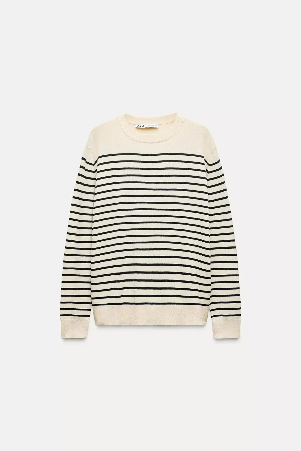 Por último, tenemos uno de los modelos que te serán útiles para arreglar cualquier look. Un jersey con estampado marinero siempre se encargará de favorecer tu figura y, junto a un pantalón vaquero recto, puede dar como resultado un outfit antiedad ideal para toda ocasión. Si además quieres dotar de un toque llamativo tus looks, te recomendamos añadir unas bailarinas en color burdeos. Consíguelo en Zara por 22,95€.