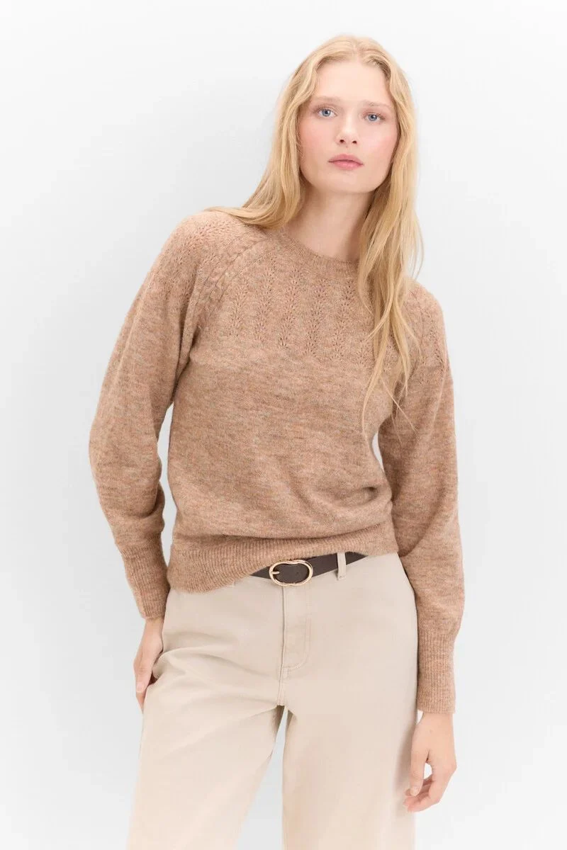 El diseño de este jersey combina un escote redondo clásico con mangas largas tipo ranglán, ofreciendo un ajuste cómodo y favorecedor. El detalle de calado en el canesú aporta un toque delicado y femenino, mientras que los acabados acanalados aseguran una estructura impecable. Su corte recto lo convierte en una opción versátil que puedes llevar en cualquier ocasión.
