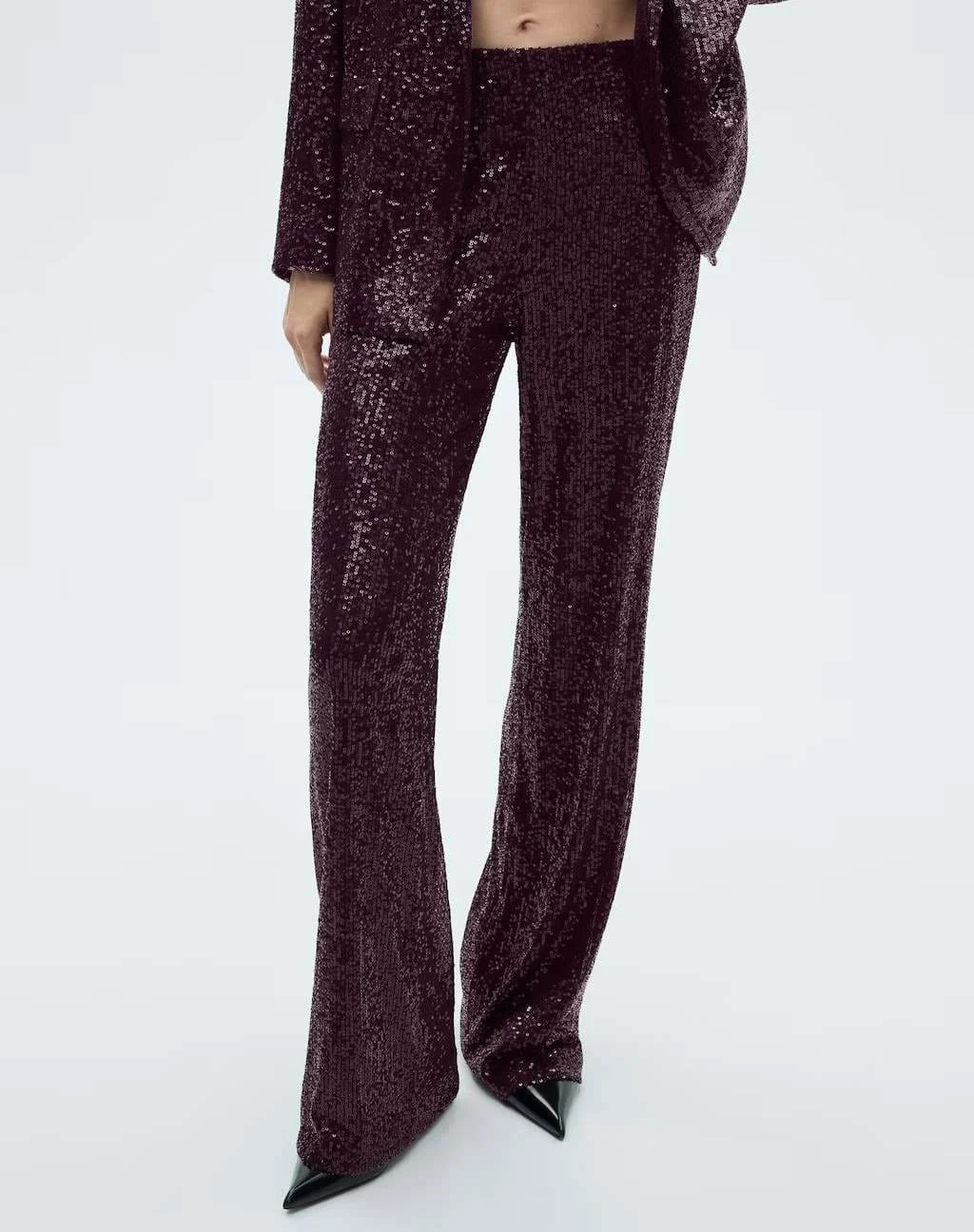 Empezamos con este pantalón palazzo con lentejuelas que Mango acaba de lanzar. Tiene un diseño largo, amplio, de tiro medio y cintura con goma elástica. Está hecho a base de lentejuelas y su diseño incluye una blazer confeccionada con el mismo material que forma un conjunto perfecto de dos piezas con este pantalón. Sin duda alguna, es una de las opciones más llamativas que puedes encontrar en este apartado hoy por hoy. Cuesta 39,99€.