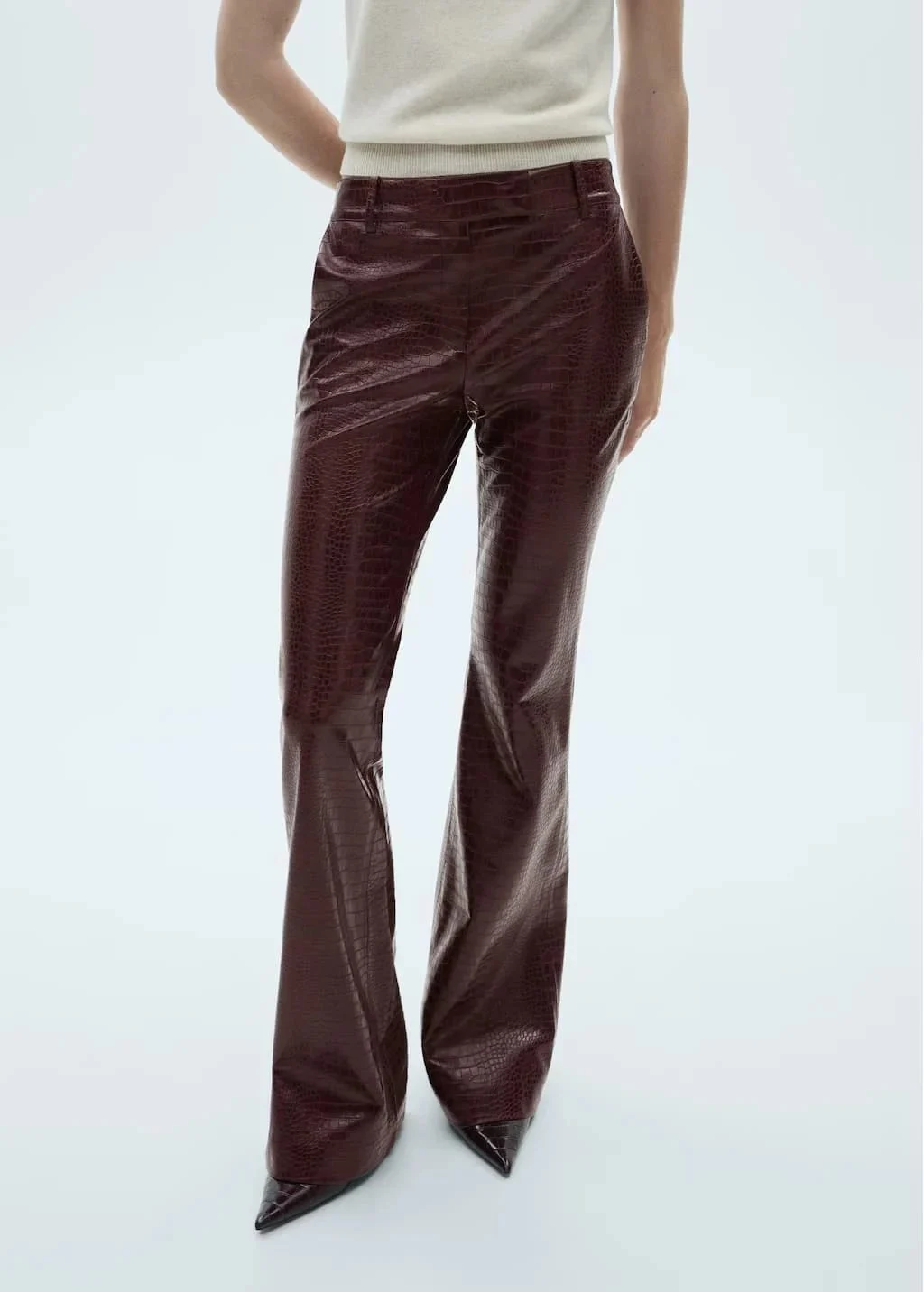 Para finalizar, nos encontramos con una de las propuestas más llamativas de Mango para este otoño e invierno. Este pantalón flare con efecto de piel de serpiente cuenta con un diseño largo, una campana, dos bolsillos en los laterales, trabillas para un cinturón y un cierre oculto de botón, con gancho y cremallera. Está disponible en color burdeos, la tonalidad por excelencia de esta temporada, por solo 39,99€.