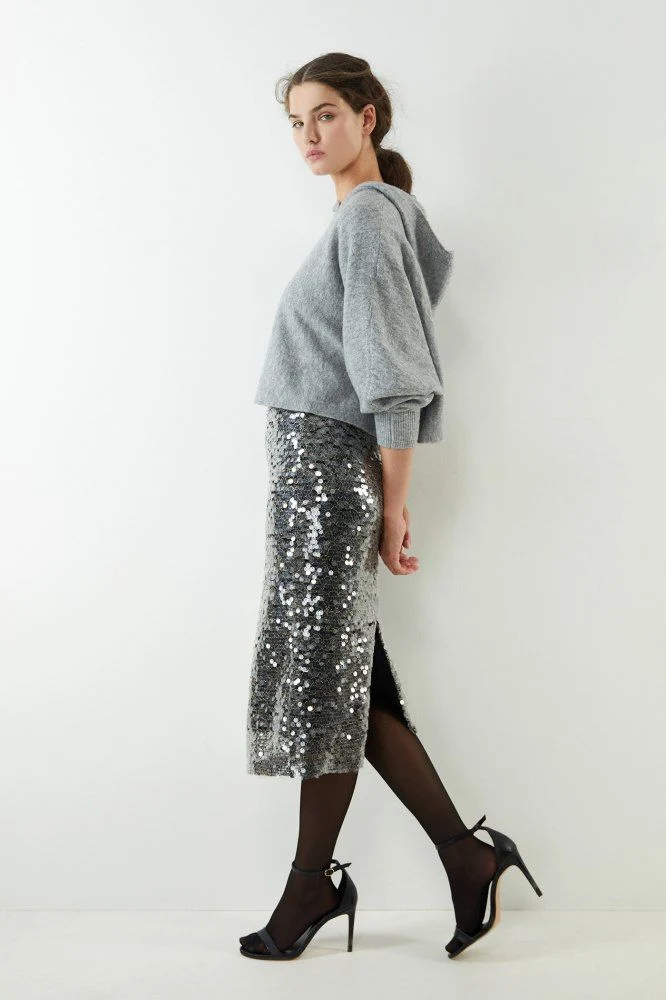 La falda tubo de lentejuelas de Sfera es la elección ideal para quienes desean un look glamuroso y sofisticado para las fiestas. Con un corte midi que favorece la figura, esta falda se adapta perfectamente a cualquier evento de noche, añadiendo un toque de brillo y elegancia a tu conjunto. Las lentejuelas, que cubren toda la prenda, capturan la luz en cada movimiento, asegurando que serás el centro de atención.