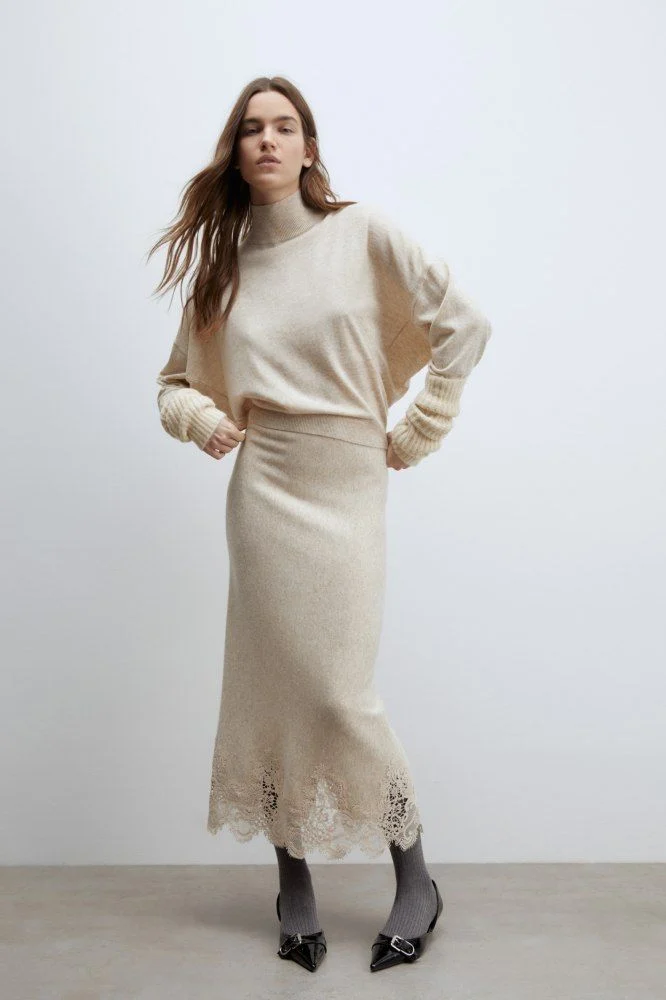 Puedes combinarla con una blusa sencilla para un look diario o un top más elegante para ocasiones especiales. Ya sea con tacones o botines, la falda midi de punto con encaje de Sfera se adapta a diferentes estilos, garantizando que siempre te veas espectacular.