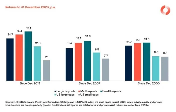 Las adquisiciones de private equity han superado a las empresas estadounidenses de pequeña y gran capitalización por un margen significativo (neto de comisiones), en el largo plazo. Además, la deuda privada ofrece un rendimiento superior al de los bonos corporativos. La naturaleza más fiable de la financiación respaldada por activos también contribuye a un perfil de rentabilidad más estable que el de los bonos corporativos.