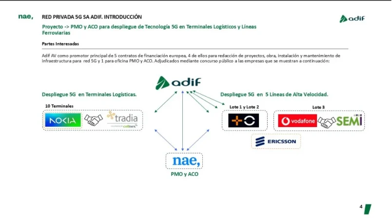 La consultora Nae es la encargada como PMO (Project Management Office) del proyecto para «dotar a las 5 líneas de alta velocidad y 10 terminales logísticas (estaciones, básicamente) de cobertura 5G puro, lo que significa que son dos proyectos realmente, uno el corredor ferroviario y otro las estaciones en las que terminan los trenes, donde se quiere contar con 5G SA para la gestión del tráfico de mercancías digital. Una de ellas estará, por ejemplo, en el barrio de Villaverde, en Madrid», nos explica Benjamín Rodríguez Caneiro, el experto en estrategia tecnológica de Nae.