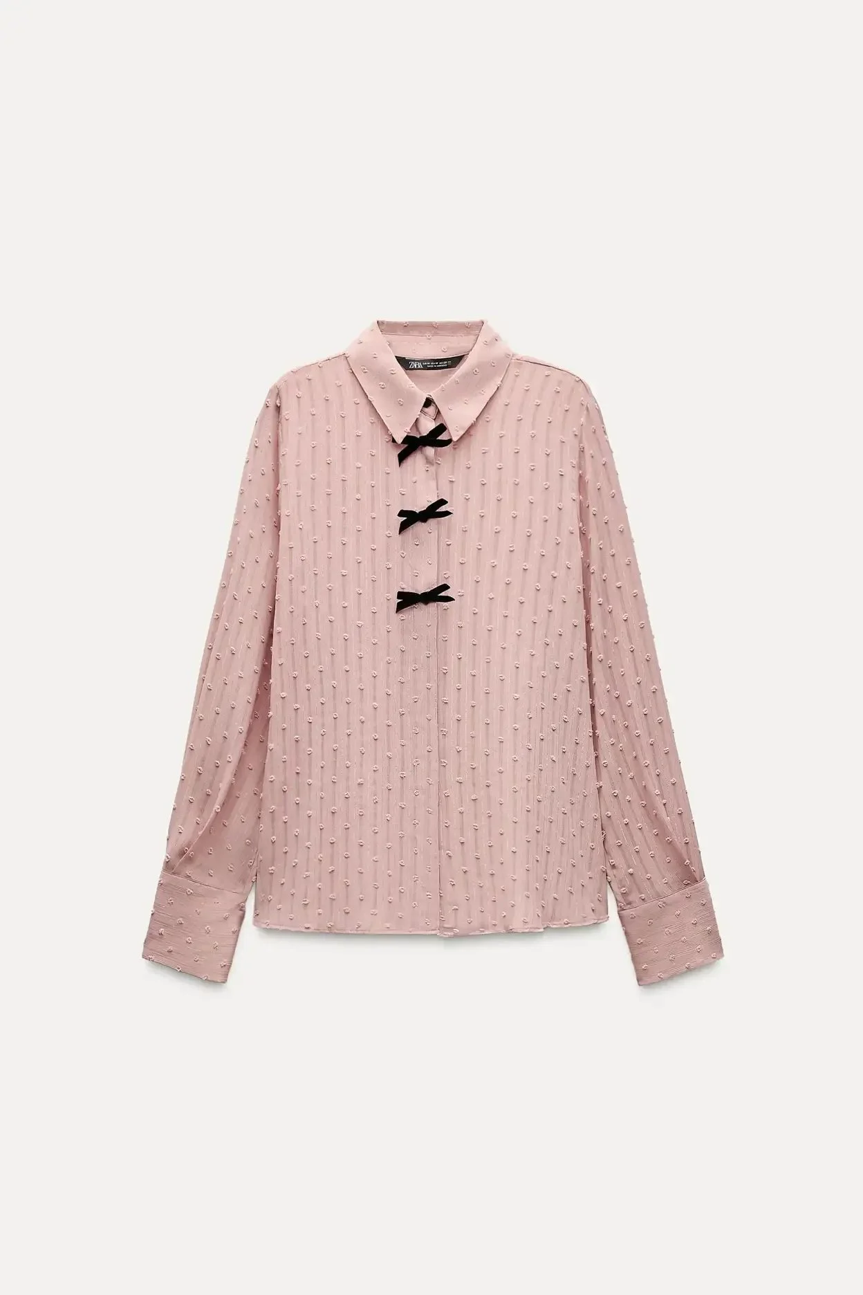 En vez de optar por los típicos colores navideños, como el verde, rojo, negro y blanco, esta blusa apuesta por el rosa para dar lugar a siluetas femeninas y elegantes que también vienen de lujo para los eventos navideños. Este modelo cuenta con botonadura clásica y detalle de lazos, y su precio es de 22,95€ en Zara (referencia 9961/862).