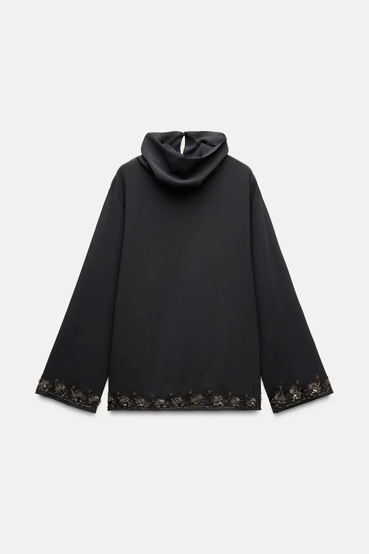 Si ya de por sí las blusas negras son un must en cada vestidor, durante el otoño-invierno lo son más todavía. La diferencia es que durante esta época los diseños se tornan más elegantes y exclusivos, justamente pensando en la gran cantidad de eventos especiales y sofisticados a los que se suele asistir. Este diseño cuenta con tejido semitransparente y cuello fluido. Está disponible en Zara y cuesta 69,95€ (referencia 7521/261).