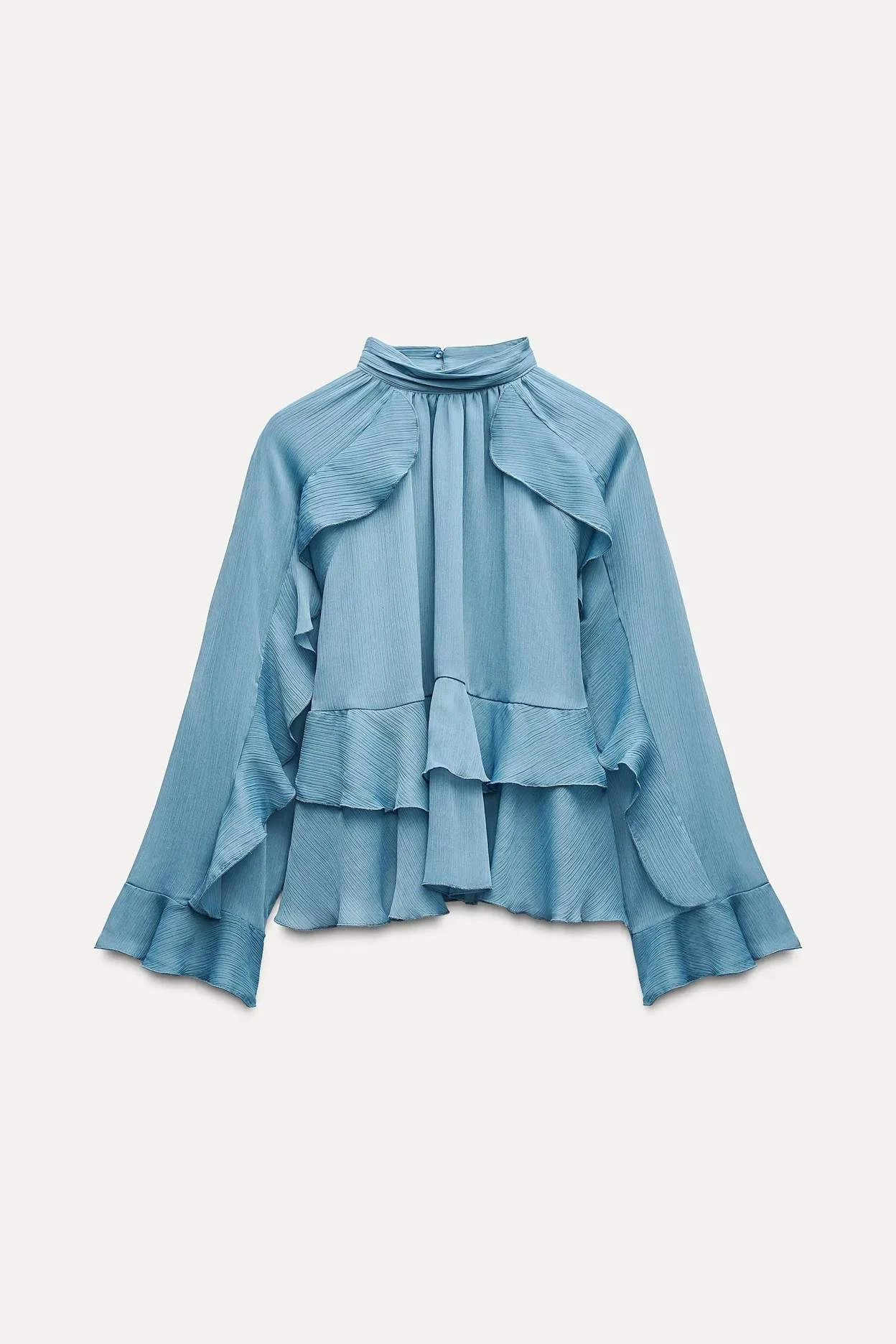 Al igual que el modelo en color rosa que hemos visto anteriormente, esta blusa romántica de volantes con manga amplia y cuello cruzado en color azul cielo aparece como una de las posibilidades más originales de cara a las fiestas navideñas, sobre todo si entre tus objetivos está dejar a un lado los típicos blancos, rojos, negros y crudos. Es tuya por 25,95€ y la encuentras en Zara (referencia 5029/168).