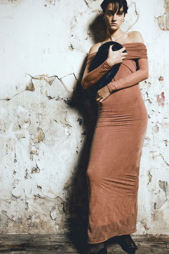 Para despedir el año con estilo, Sfera nos sorprende con un vestido que redefine la elegancia. Su diseño de hombros descubiertos y escote recto, complementado con un coqueto cuello mao, es ideal para quienes buscan un look sofisticado y moderno. Perfecto para cualquier celebración, este vestido largo combina comodidad y glamour.