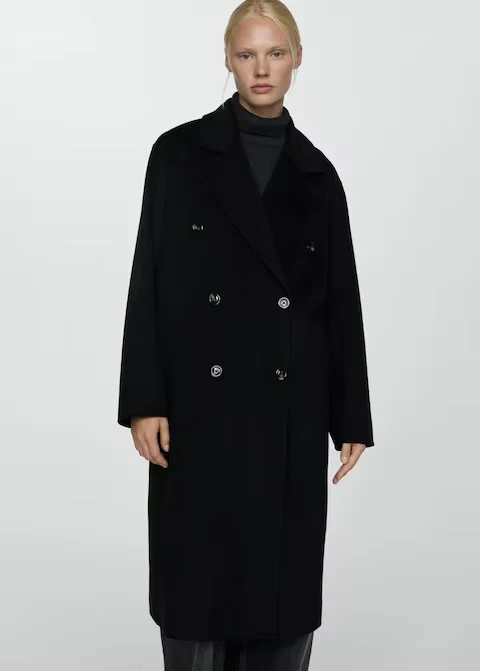 Inicialmente tenemos este abrigo clásico de corte oversize, confeccionado en lana y hecho a mano que seguramente desde este momento se convertirá en uno de tus favoritos. Gracias a su tonalidad negra, puedes optar por llevar este modelo con cualquier look, logrando así impregnar de sofisticación y elegancia todos tus outfits por medio de la estética que transmiten sus botones y el doblez de su cuello. Está disponible en Mango y lo puedes comprar por 119,99€.