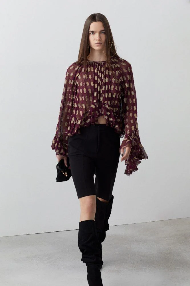 Con un precio de 39,99 €, esta blusa se convierte en una excelente opción para transformar tus looks. El cierre trasero de botón no solo añade funcionalidad, sino que también refuerza el estilo refinado de la prenda. Los lunares en lúrex le dan ese brillo sutil que la hace perfecta tanto para eventos especiales como para elevar tus atuendos diarios. Su diseño versátil se adapta fácilmente a pantalones de vestir o faldas, creando conjuntos sofisticados y llamativos.