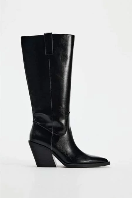 Para finalizar, tenemos este modelo clásico de bota cowboy con un elegante acabado en punta y unos tiradores laterales que facilitan el calce. El tacón mide 7 cm y se encarga de dotar a la bota de un aire sofisticado y estiloso sin poner en riesgo la comodidad. Además, gracias a su diseño versátil es ideal para llevar tanto con looks formales como con outfits más casuales. Este par cuesta 45,95€ y lo puedes encontrar en Zara (referencia 3006/410).