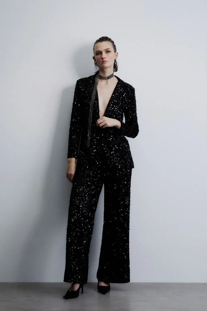 Combinando a la perfección con el blazer, el Pantalón de lentejuelas completa el conjunto con su diseño cómodo y chic. Este pantalón, que cuesta 29,99 €, cuenta con una goma en la cintura para un ajuste cómodo y seguro. Las lentejuelas, al igual que en el blazer, añaden un toque de elegancia y glamour, haciendo de este conjunto una opción ideal para brillar en cualquier ocasión. Con este conjunto, te aseguras de destacar y sentirte fabulosa en todo momento.