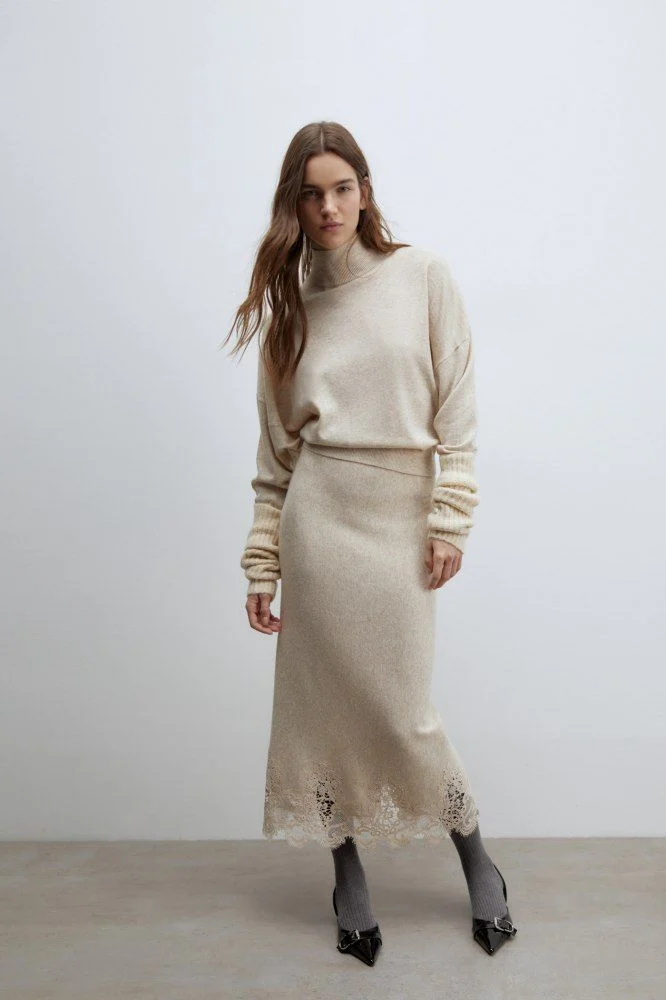 La Falda midi con detalle de encaje es una pieza elegante y femenina que aporta un toque de sofisticación a cualquier conjunto. Confeccionada en punto y con un delicado encaje, esta falda midi se adapta perfectamente al cuerpo, creando una silueta estilizada. A un precio de 35,99 €, es una opción ideal para quienes buscan una prenda versátil y chic para ocasiones especiales o el día a día.