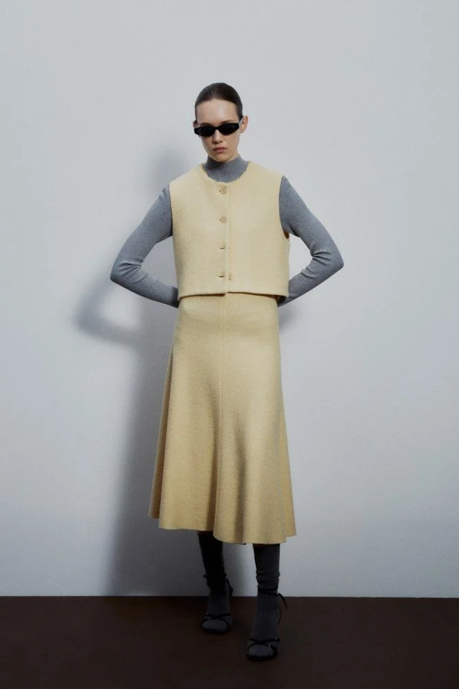 El Chaleco conjunto falda es el complemento perfecto para la falda mantequilla. Con su cuello redondo y mangas sisa, este chaleco aporta un toque de modernidad y frescura a tu atuendo. El cierre delantero con botones y el tejido combinado en lana añaden un toque de elegancia y calidez. A un precio de 39,99 €, este chaleco se convierte en una prenda versátil y chic para diversas combinaciones.