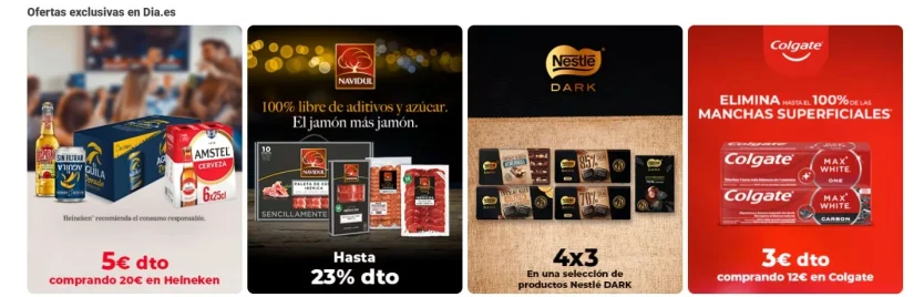 Actualmente, en la propia página web del supermercado español, los consumidores podrán aprovechar los 20 euros de descuento en Dia en la primera compra online que realicen, facilitando y empujando el modelo de compra online. Por otro lado, en la misma página el cliente encontrará descuentos ya no solo de marca blanca, también en marcas de fabricante como Navidul, Nestlé o Heineken, entre otras.