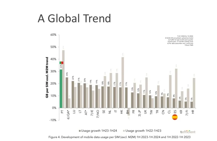 Según los informes publicados a nivel mundial de la evolución del consumo de datos móviles, España ocupa una posición baja, en lo que se refiere a ese crecimiento interanual, y a su lado, con posiciones también muy bajas, se sitúan países como Finlandia, Corea de Sur o Hong Kong, que según los analistas «son históricamente campeones mundiales del tráfico de datos».