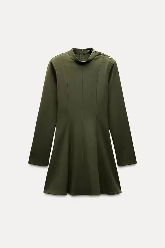 Por último, tenemos este vestido sencillo, pero que cuenta con un toque bastante especial. Una vez más, se trata de un diseño corto, en color caqui (una de las tonalidades más destacadas de la temporada) y con un cuello alzado que le impregna un punto extra de sofisticación. Además, los botones dorados sobre el hombro hacen de este ejemplar uno de los más discretos y elegantes al mismo tiempo. Zara lo tiene disponible a un precio de 29,95€ (referencia 8372/323).