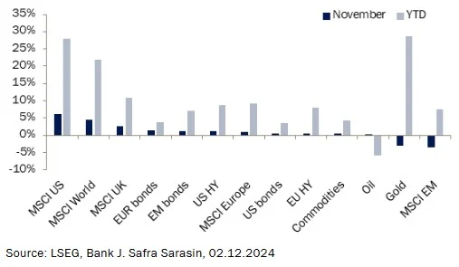 La victoria de los republicanos en las elecciones del 5 de noviembre llevó al mercado a valorar los probables cambios en la orientación política. El optimismo del mercado ante los posibles recortes fiscales y la desregulación llevó a la renta variable estadounidense a su mayor subida mensual del año. Las perspectivas de una menor regulación también llevaron al bitcoin a un importante repunte tras las elecciones.