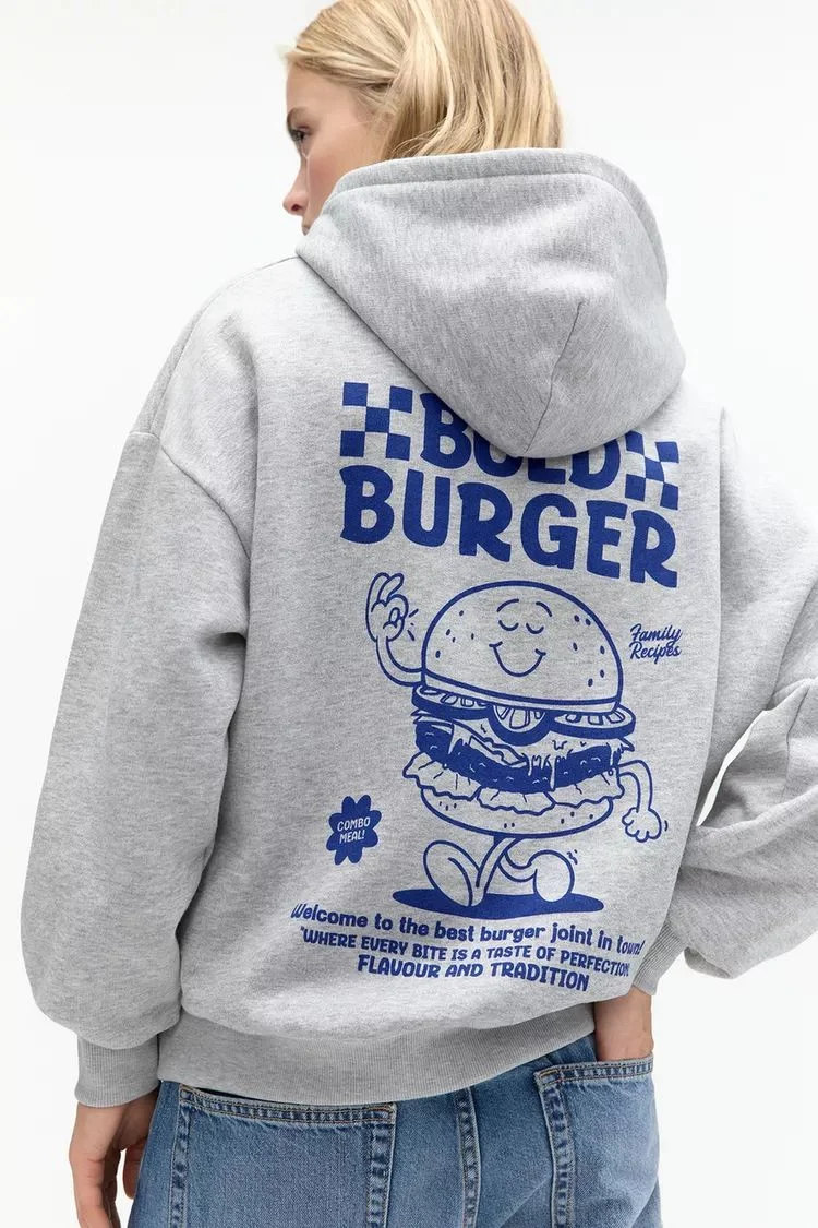 La sudadera capucha hamburguesa de Pull&Bear es la prenda perfecta para quienes buscan comodidad y un toque de humor en su estilo. Con un diseño oversize de color gris y un gráfico de hamburguesa acompañado de un texto en contraste, esta sudadera añade un toque divertido y original a cualquier look. Es ideal para esos días en los que quieres estar cómodo pero no pasar desapercibido.