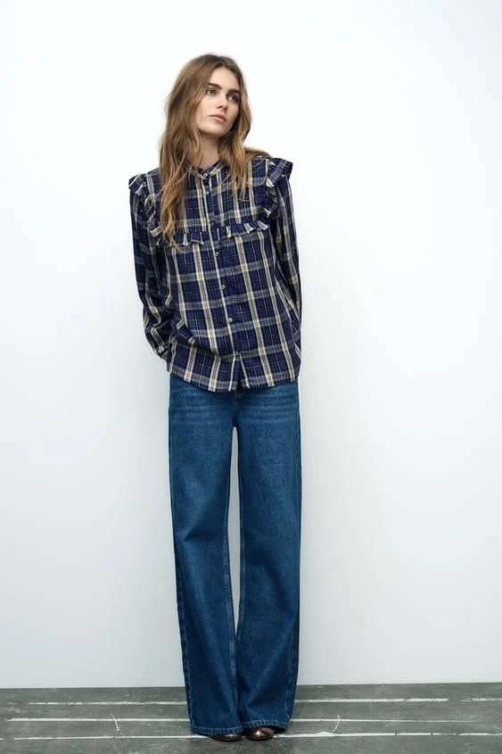 Este invierno, la camisa de cuadros hilo metalizado de Zara se convierte en una opción ideal para quienes buscan marcar la diferencia. Con un diseño elegante y moderno, su tejido con hilo metalizado le da un toque sofisticado que eleva cualquier look. Además, su cuello redondo y los volantes en las mangas aportan un detalle único que destaca frente a las típicas camisas de cuadros.