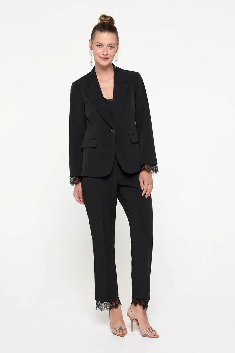 El pantalón largo de traje, de tiro alto, incluye un elegante detalle de encaje en el bajo, que lo convierte en la pareja ideal para la blazer. Su cierre de corchete asegura un ajuste cómodo y estilizado. Hazte con este conjunto en color negro y redefine tu estilo esta temporada.